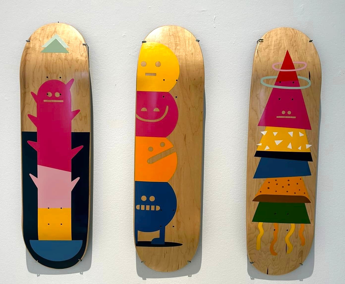 Este de aquí es un trabajo muy de diseñador, consiguiendo con una paleta de colores planos, desde lápices de color y acrílicos, una iconografía de aire pop-naïf, simple y alegre, de formas recortadas.